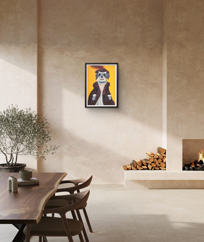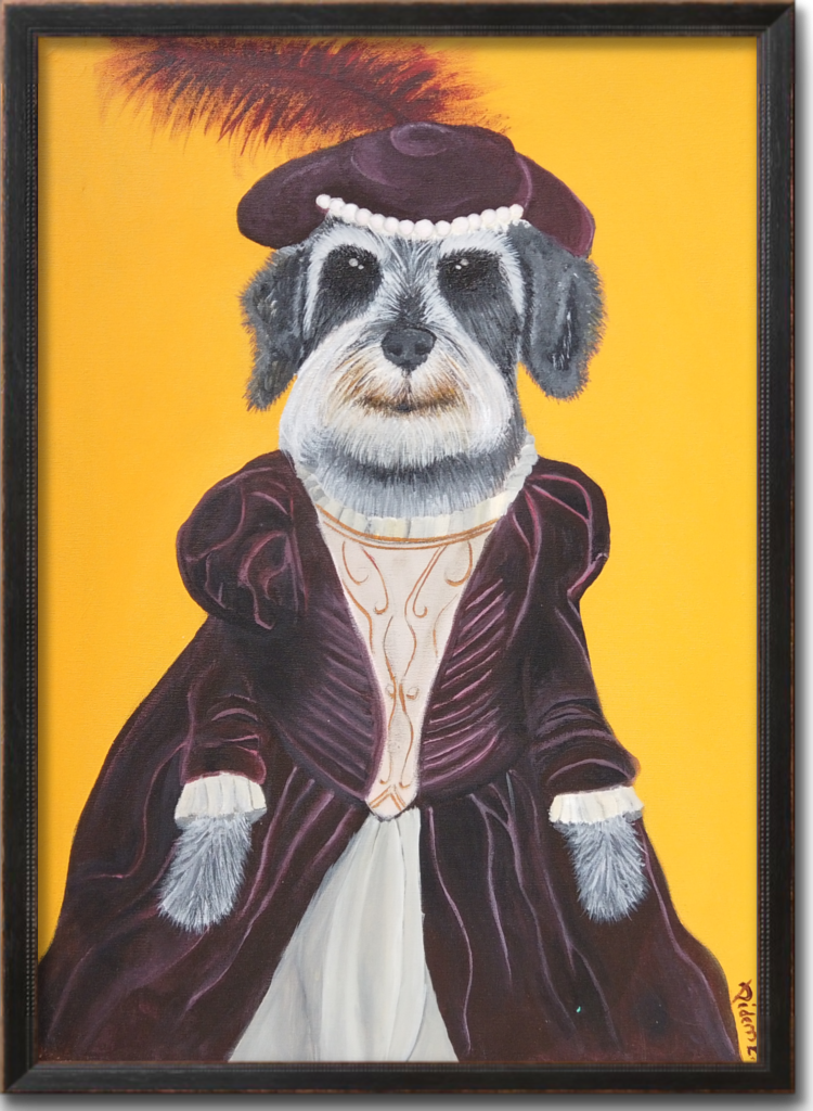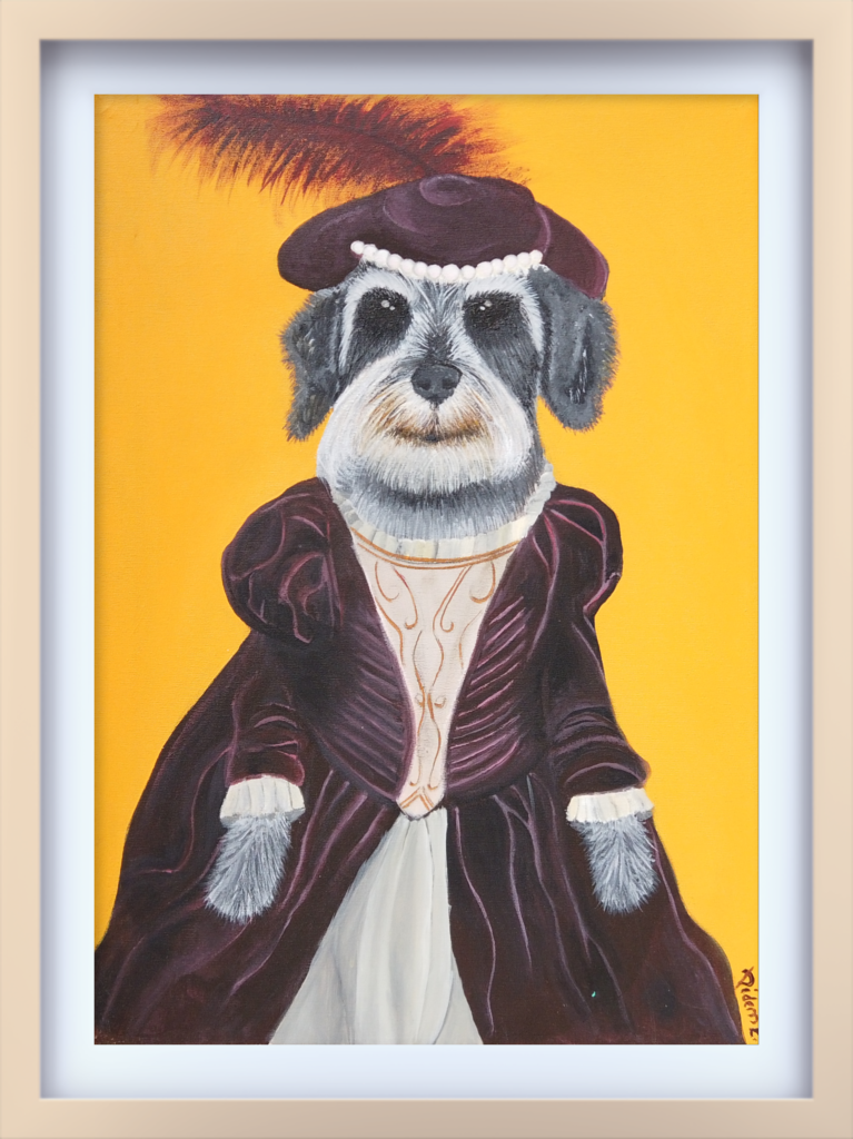 Bir portreden fazlası; bir duruşun, bir ismin ve sarsılmaz bir asaletin tuvale yansımış hali. Nietzsche, Schnauzer ciddiyetini Viktoryen bir zarafetle harmanlayarak, izleyiciyi o derin ve sorgulayan bakışlarıyla selamlıyor. Kadife morun ağırlığı, sarı fonun keskinliğiyle birleşirken; inci kolyesi ve tüylü şapkasıyla bu portre, sadakatin en şık edisyonunu sunuyor.